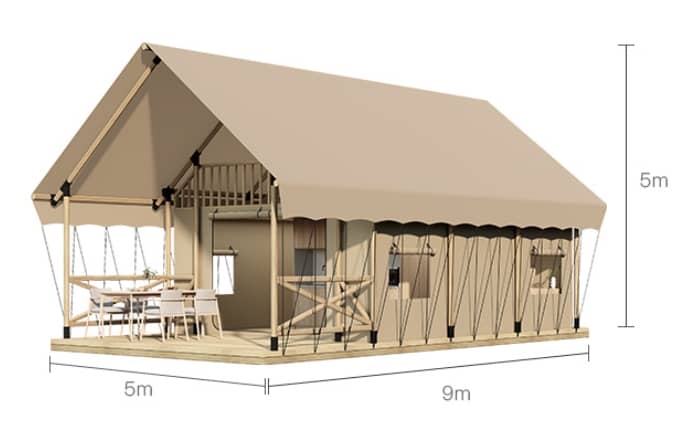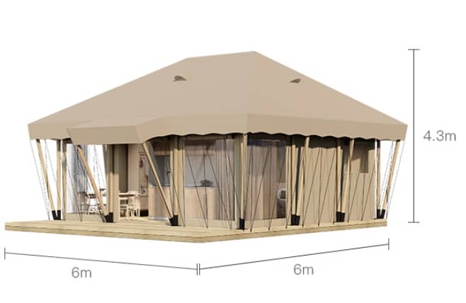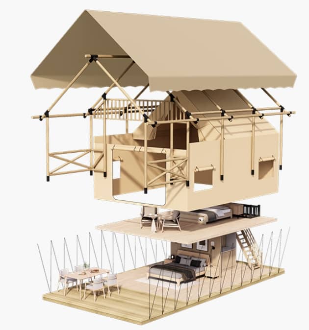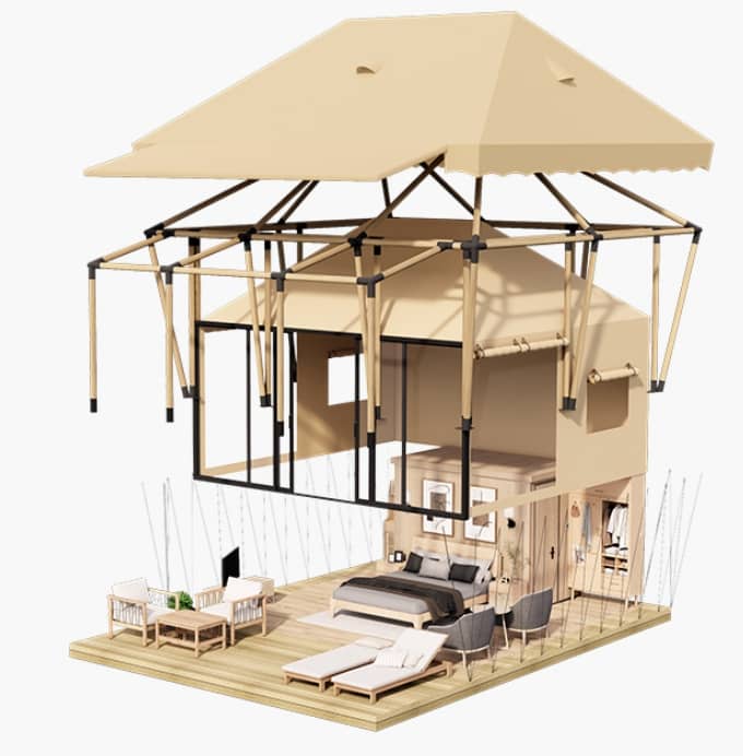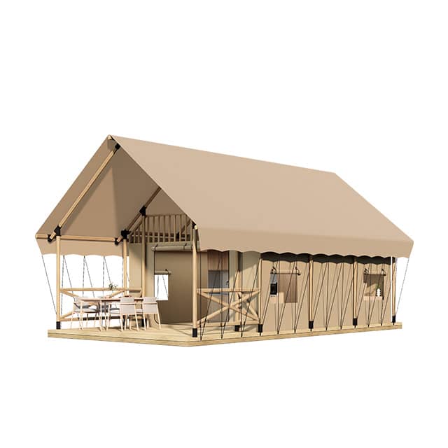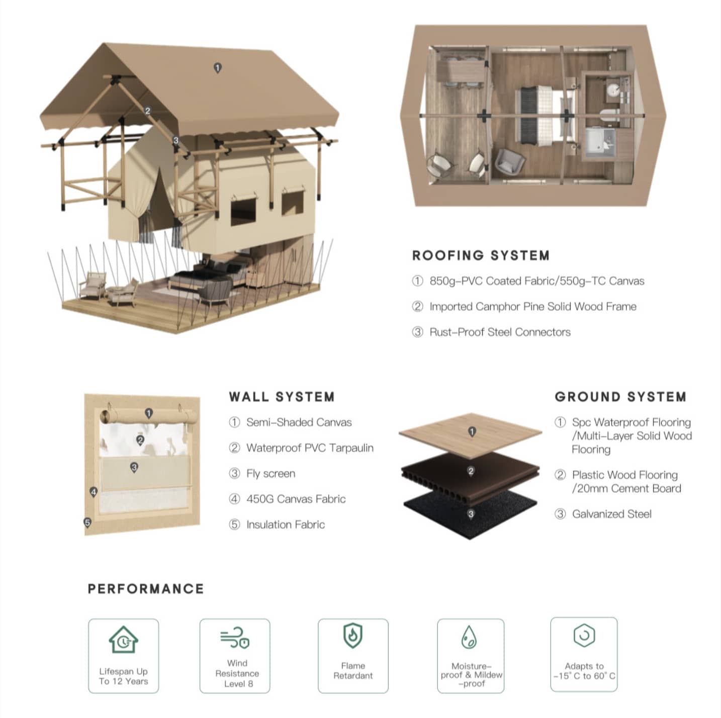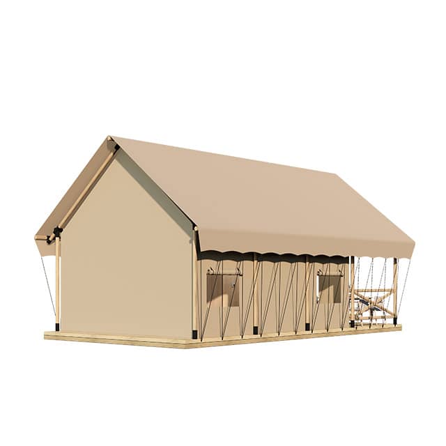 Embrace the timeless appeal of safari-style accommodation, updated for the modern traveler. Designed with a solid camphor pine frame and clad in natural canvas and durable PVC-coated cloth, these tents deliver an authentic yet refined outdoor living experience. They are naturally resistant to moisture, mold, and strong winds, making them a reliable and stylish choice for settings ranging from romantic escapes to family adventures. Available in multiple layouts, from the cozy A13 to the spacious BS48 model.